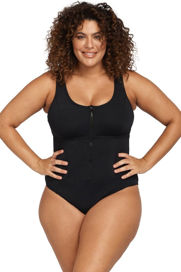 Artesands fits your curves. Make a curve statement in our Artesands Cezanne plus size one piece, the most flattering swimsuit shape EVER. Our Cezanne one piece has a mock knot tie at the front that covers a full internal cup...